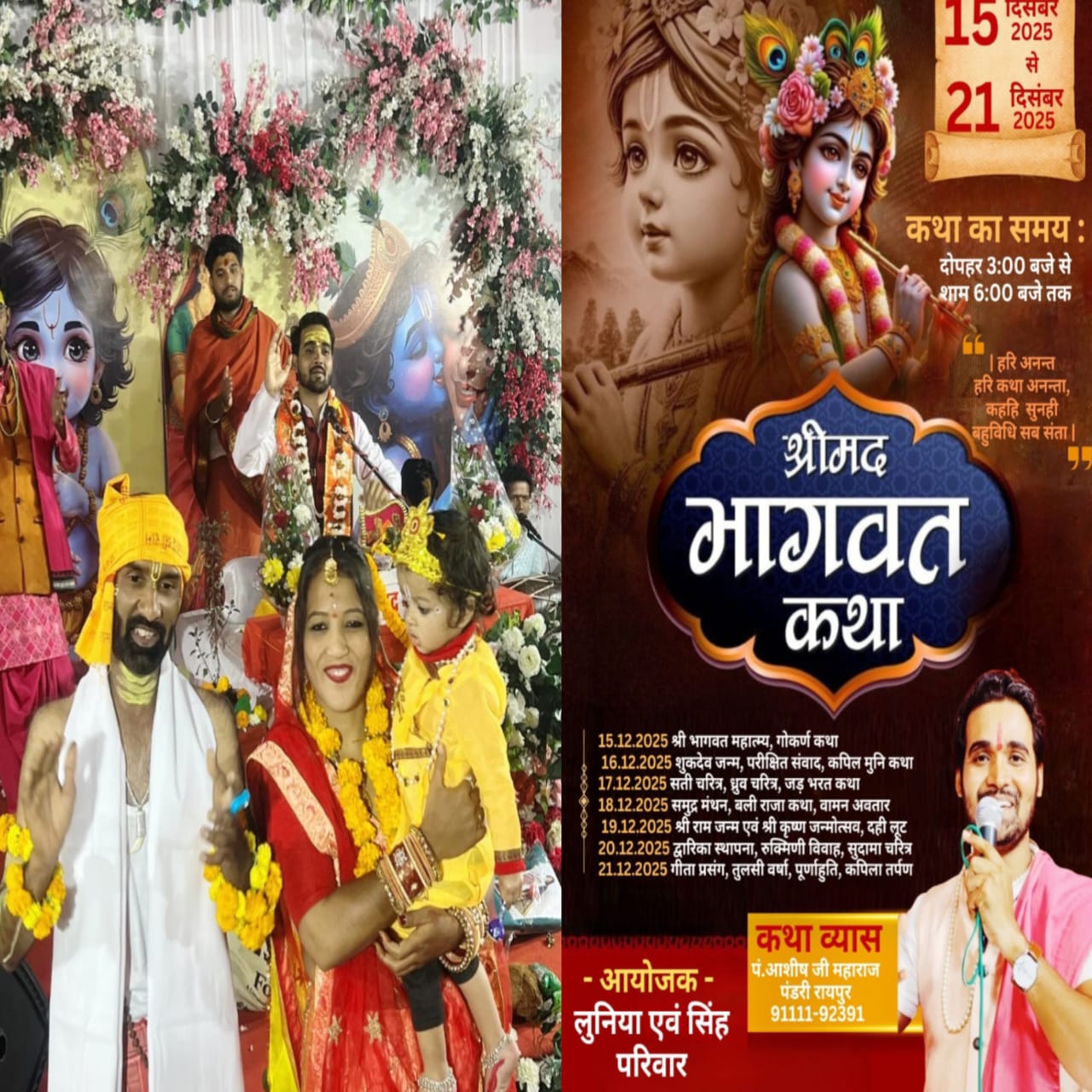 रायपुर पुरानी बस्ती में आयोजित श्रीमद् भागवत महापुराण सप्ताह ज्ञान यज्ञ जो कि 15 दिसंबर 2025 से प्रारंभ होकर 21 दिसंबर 2025 तक कथा समय दोपहर 3 बजे से शाम 6 बजे तक अमृतमय धारा प्रवाहित हो रही है जिसमें व्यास कथावाचक आचार्य आशीष महाराज के मुखारविंद से अमृतमय धारा का प्रवाह हो रहा है और भक्तजन श्रद्धा,भक्ति भाव से युक्त होकर के श्रवण पान कर रहे हैं l