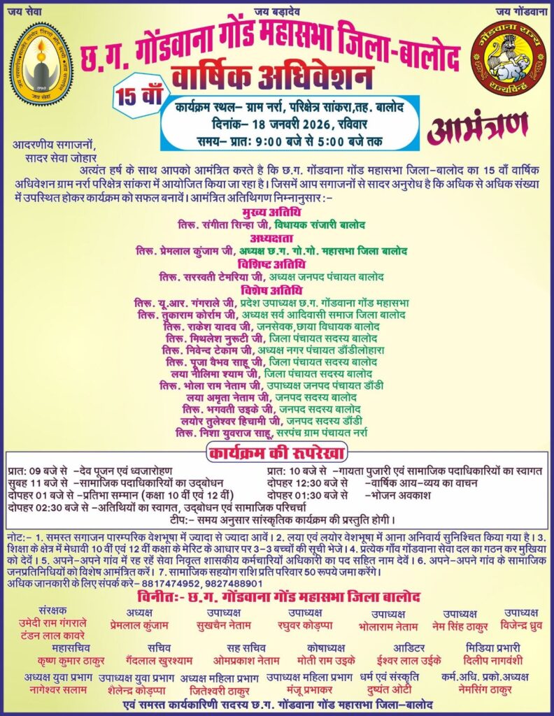 छत्तीसगढ़ गोंडवाना गोंड महासभा जिला बालोद का 15वां जिला स्तरीय वार्षिक अधिवेशन आगामी 18 जनवरी 2026 (रविवार) को ग्राम नर्रा, परिक्षेत्र सांकरा, तहसील बालोद में आयोजित किया जाएगा। अधिवेशन की आवश्यक तैयारियों को लेकर आज दिनांक 04 जनवरी 2026 को ग्राम नर्रा में सांकरा परिक्षेत्र आदिवासी गोंडवाना गोंड समाज की महत्वपूर्ण बैठक आयोजित की गई।