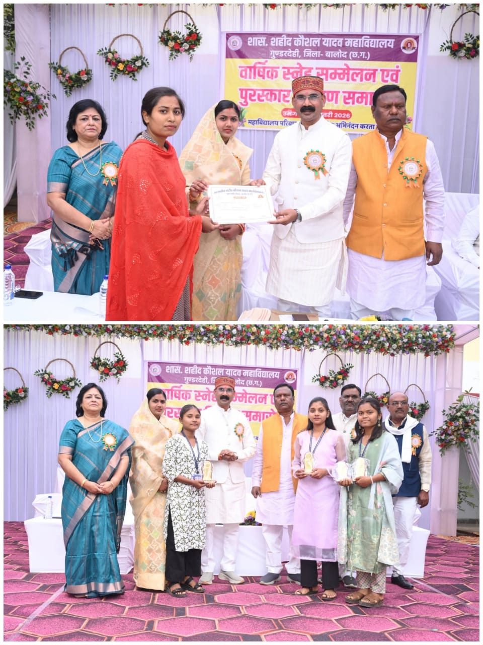 आज शासकीय शहीद कौशल यादव महाविद्यालय, गुंडरदेही में आयोजित “वार्षिक स्नेह सम्मेलन एवं पुरस्कार वितरण समारोह” में गुंडरदेही विधायक श्री कुंवर सिंह निषाद मुख्य अतिथि के रूप में शामिल हुए। उन्होंने मां सरस्वती की पूजा-अर्चना कर कार्यक्रम का शुभारंभ किया। कार्यक्रम की शुरुआत छत्तीसगढ़ की अस्मिता के प्रतीक अरपा–पैरी राजकीय गीत से हुई।