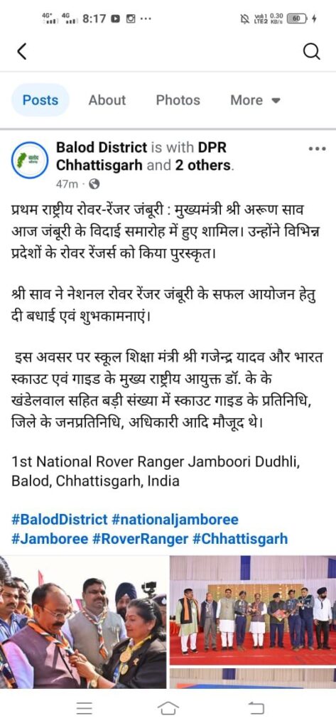 इन तमाम विवादों के बीच आज समापन समारोह में अलग–अलग राज्यों से आए रोवर–रेंजर प्रतिभागियों को उप मुख्यमंत्री श्री अरुण साव द्वारा पुरस्कृत किया गया। कार्यक्रम गरिमामय रहा और प्रतिभागियों का उत्साह भी देखने लायक था।