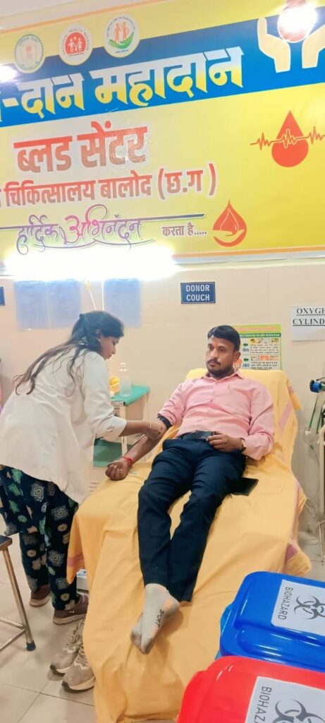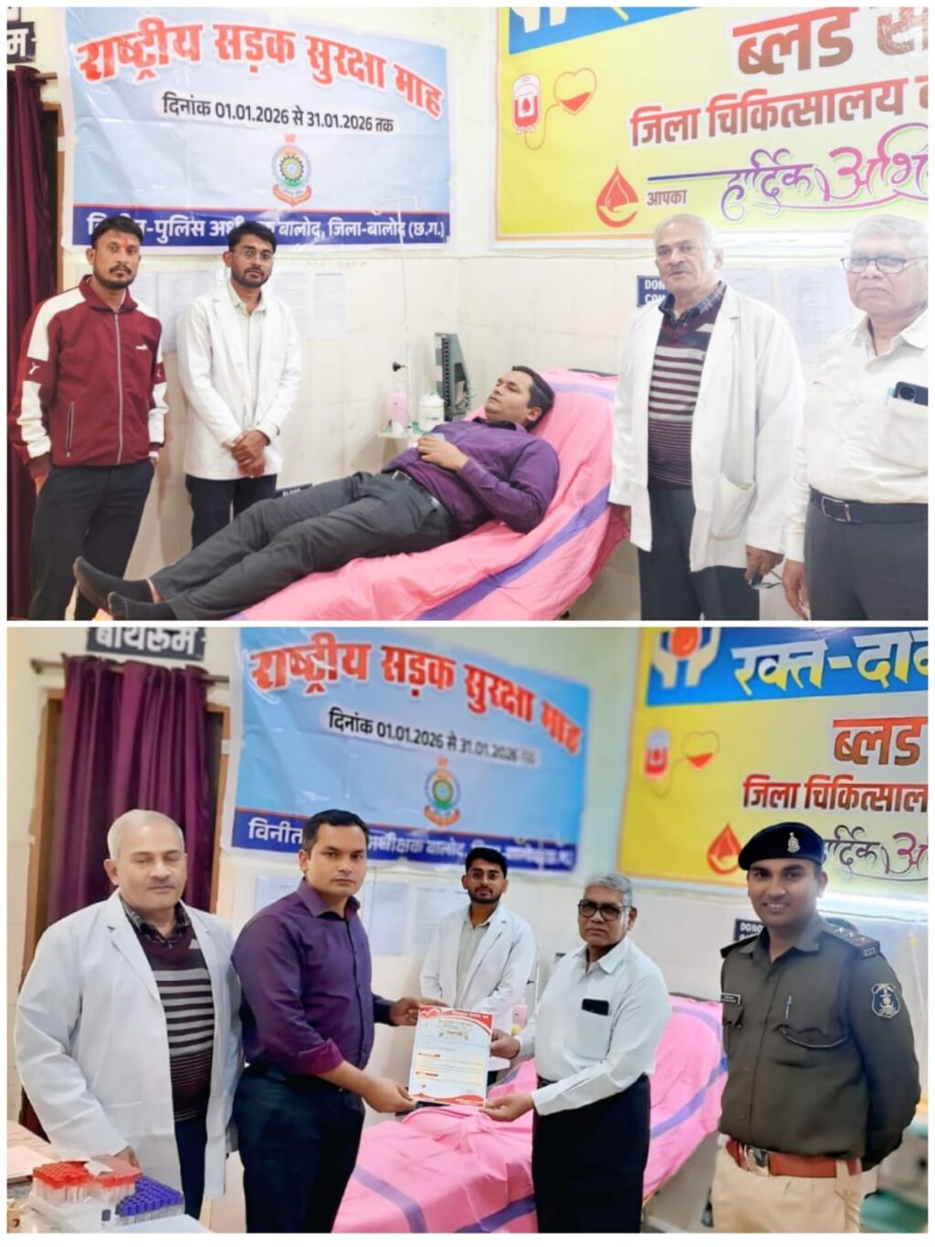 सड़क सुरक्षा माह 2026 के अंतर्गत सड़क दुर्घटनाओं में घायलों की त्वरित सहायता एवं जन-जागरूकता के उद्देश्य से बालोद पुलिस द्वारा एक दिवसीय रक्तदान शिविर का आयोजन जिला चिकित्सालय बालोद में किया गया।