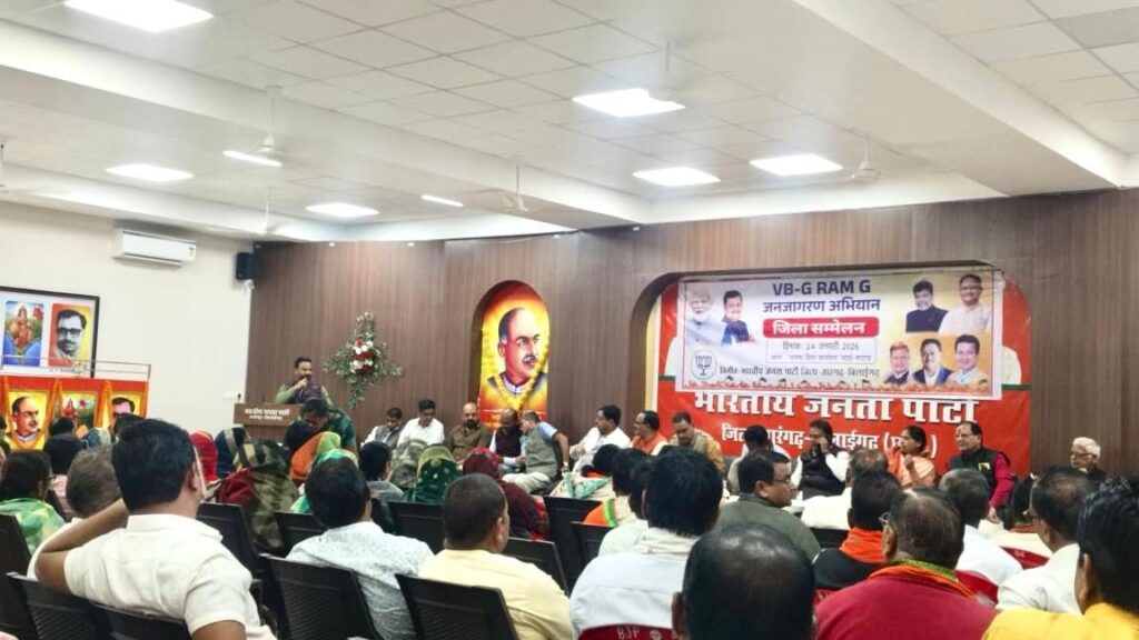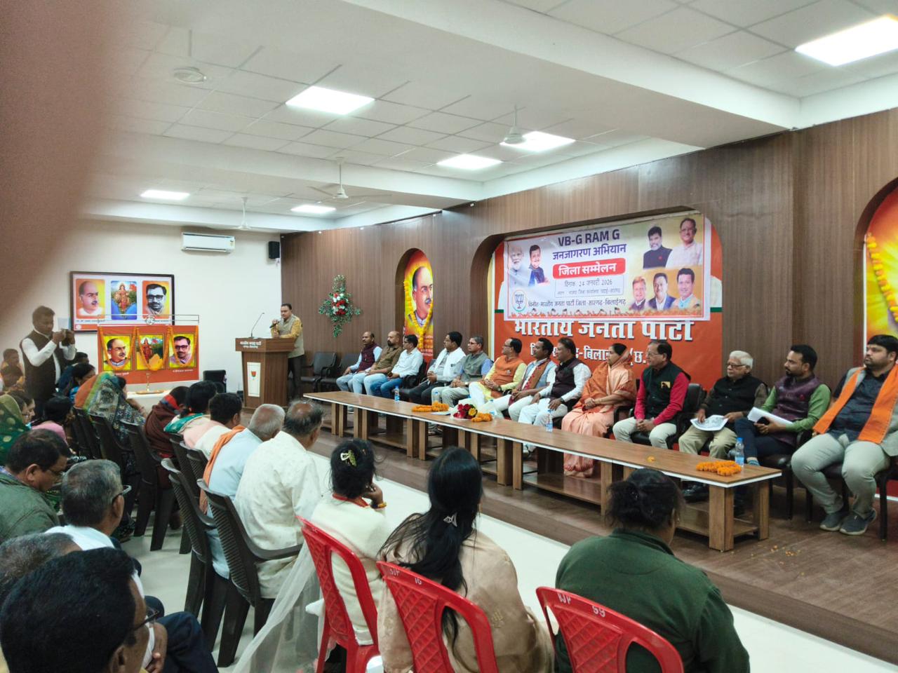 सारंगढ़ । VB -G RAM G (विकसित भारत-गारंटी फॉर रोजगार एवं आजीविका मिशन ग्रामीण) का जिला स्तरीय सम्मेलन तथा कार्यशाला संपन्न हुआ। जिसमे मुख्य अतिथि सासंद राधेश्याम राठिया, वक्ता जिला प्रभारी शंकर अग्रवाल की उपस्थिति में संपन्न हुआ है। कार्यशाल तथा सम्मेलन को संबोधित करते हुए सांसद राठिया ने मोदी जी के विजन को बताया। जिला प्रभारी शंकर अग्रवाल ने संगठन की मजबूती और भूमिका पर संबोधन दिया। प्रदेश उपाध्यक्ष जगन्नाथ पाणिग्रही ने कार्यकर्ताओं को इस अधिनियम के बारे में विस्तार से बताया। बैठक का प्रस्तावना और भूमिका जिला अध्यक्ष ज्योति पटेल ने रखा। मीडिया से चर्चा करते हुए इस कार्यक्रम के जिला संयोजक तथा प्रदेश महामंत्री हरिनाथ खुटे ने बताया की
