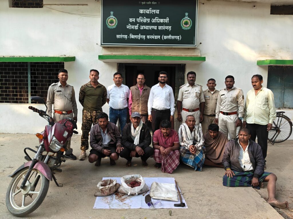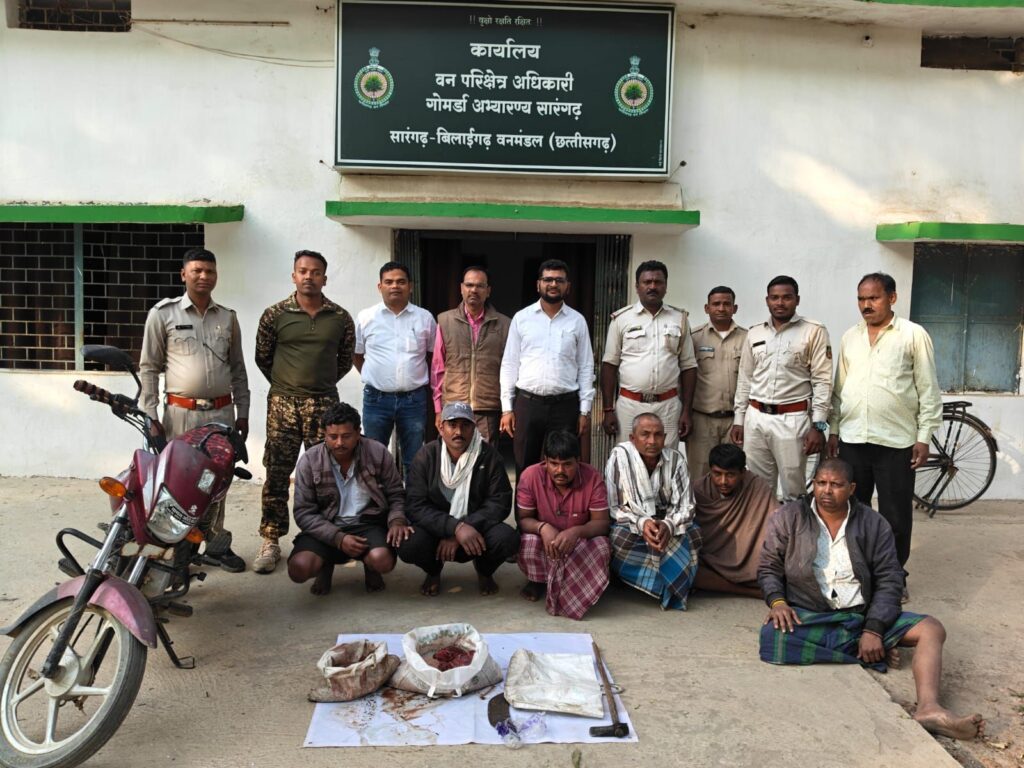 जानकारी के मुताबिक,सारंगढ़ के रेगालमुड़ा गांव क्षेत्र के जंगल मे रेगालमुड़ा के आरोपियों ने जंगल क्षेत्र में साभर का शिकार कर उसका मांस बांटने की तैयारी कर ली थी। मौके से शिकार और शिकार में इस्तेमाल किए गए हथियार, धारदार औजार और वन्यजीव के अवशेष बरामद किए गए हैं। वन विभाग ने सभी आरोपियों के खिलाफ वन्यजीव संरक्षण अधिनियम के तहत मामला दर्ज कर लिया है।