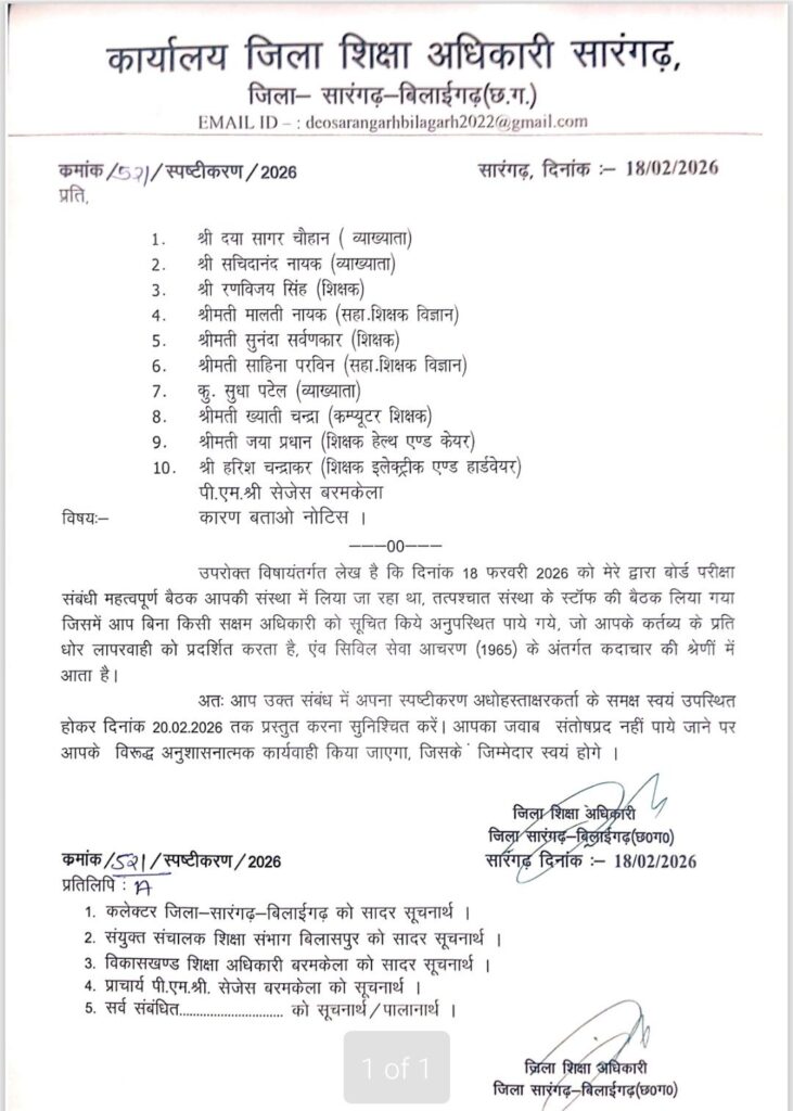 प्राप्त जानकारी के अनुसार 18 फरवरी 2026 को बोर्ड परीक्षा की तैयारियों को लेकर संस्था में आवश्यक बैठक आयोजित की गई थी। बैठक के पश्चात स्टॉफ मीटिंग भी ली गई, जिसमें संबंधित शिक्षक बिना किसी सक्षम अधिकारी को सूचना दिए अनुपस्थित पाए गए। जिसको लेकर जिला शिक्षा अधिकारी जे आर डहरिया ने कड़े रुख अपनाये है और इसे कर्तव्य के प्रति गंभीर लापरवाही मानते हुए सिविल सेवा आचरण नियम (1965) के तहत कदाचार की श्रेणी में रखा गया है। और नोटिस जारी किया गया है