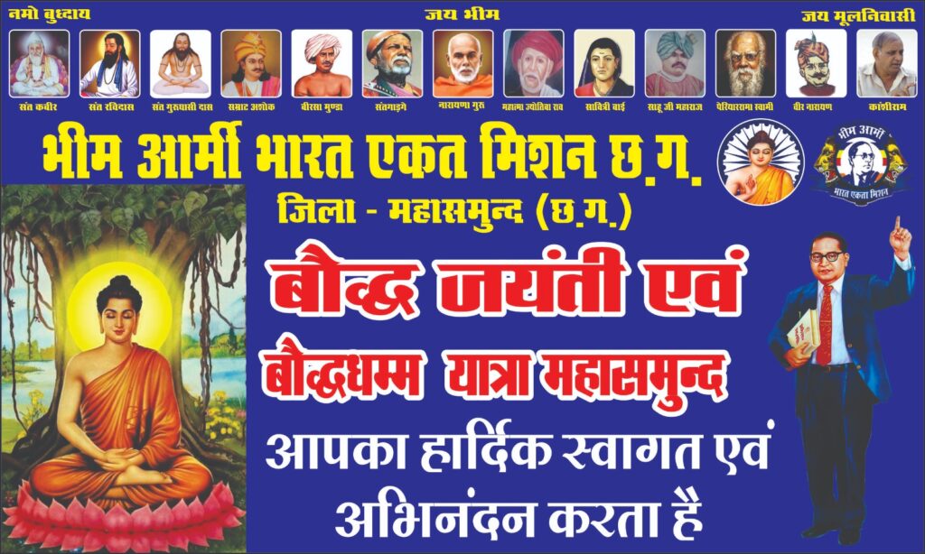 इस बुद्ध पूर्णिमा जयंती को भीम आर्मी भारत एकता मिशन महासमुंद के सभी पदाधिकारियों एवं सभी सदस्यों के द्वारा बहुत ही सुंदर नाजारों के साथ आज शाम 4 बजे नयापारा महासमुंद से बौद्धधम्म रथ प्रारंभ होकर कांग्रेस भवन तक बौद्धधम्म रथ निकाली जाएगी