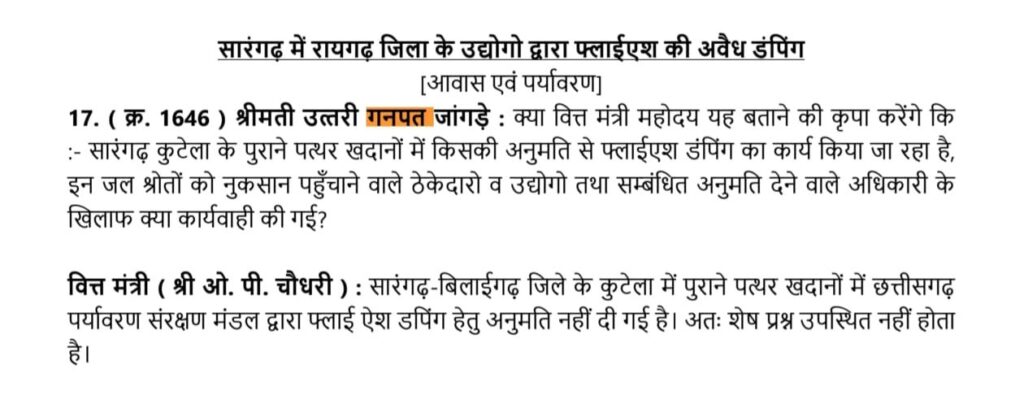 इस प्रश्न के लिखित जवाब में वित्त मंत्री श्री ओ.पी. चौधरी ने स्पष्ट किया कि छत्तीसगढ़ पर्यावरण संरक्षण मंडल द्वारा सारंगढ़-बिलाईगढ़ जिले के कुटेला में स्थित पुराने पत्थर खदानों में फ्लाईएश डंपिंग के लिए कोई अनुमति प्रदान नहीं की गई है। सरकार के इस जवाब से यह साफ हो गया है कि यदि वहां राखड़ डाली जा रही है, तो वह पूरी तरह से गैर-कानूनी है।