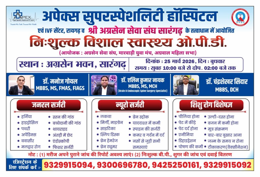 सारंगढ़। अपेक्स सुपरस्पेशलिटी हॉस्पिटल एवं आईवीएफ सेंटर, रायगढ़ तथा श्री अग्रसेन सेवा संघ, मारवाड़ी युवा मंच और मारवाड़ी महिला सभा सारंगढ़ के संयुक्त तत्वावधान में एक निःशुल्क विशाल स्वास्थ्य ओपीडी शिविर का आयोजन किया जा रहा है। यह शिविर 25 मार्च 2026 को सुबह 10 बजे से दोपहर 2 बजे तक अग्रसेन भवन, सारंगढ़ में आयोजित होगा।
