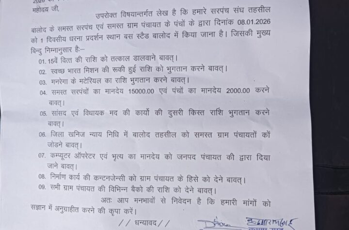 बालोद। तहसील सरपंच संघ, तहसील बालोद (जिला–बालोद) ने पंचायतों से जुड़े लंबित भुगतान और मानदेय की मांग को लेकर आंदोलन...
