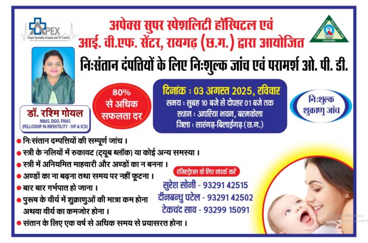 सारंगढ़- बरमकेला निः संतान दंपतियों के लिए निः शुल्क जांच एवम् परामर्श ओपीडी का आयोजन अघरिया भवन,बरमकेला मे किया जा...